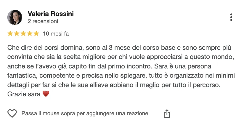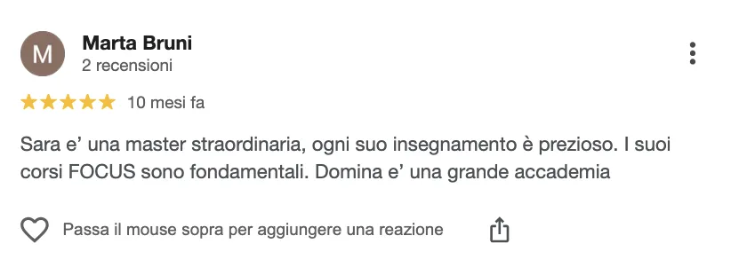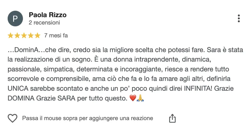 Accesso al “Domina Club” riconoscimento tramite logo personale che certifica alta competenze, igiene e professionalità, con visibilità sul sito ufficiale e canali social oltre a possibilità di collaborazioni future.